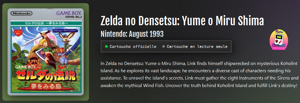 Premier opus de la série Zelda développé pour console portable, Link’s Awakening est une œuvre majeure de la Gameboy. Sorti en 1993 au Japon sous le nom "Zelda no Densetsu: Yume o Miru Shima" (ゼルダの伝説 夢をみる島), ce titre offre une aventure riche, mystérieuse et unique, loin d’Hyrule.