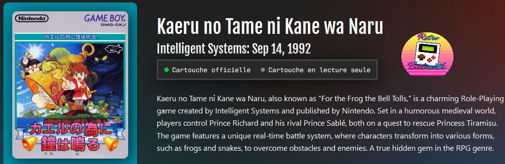 Entre énigmes, transformation en grenouille et prince un peu loser, le jeu brille par son écriture et ses mécaniques originales. Inédit à l’international, c’est un vrai trésor du catalogue Gameboy.